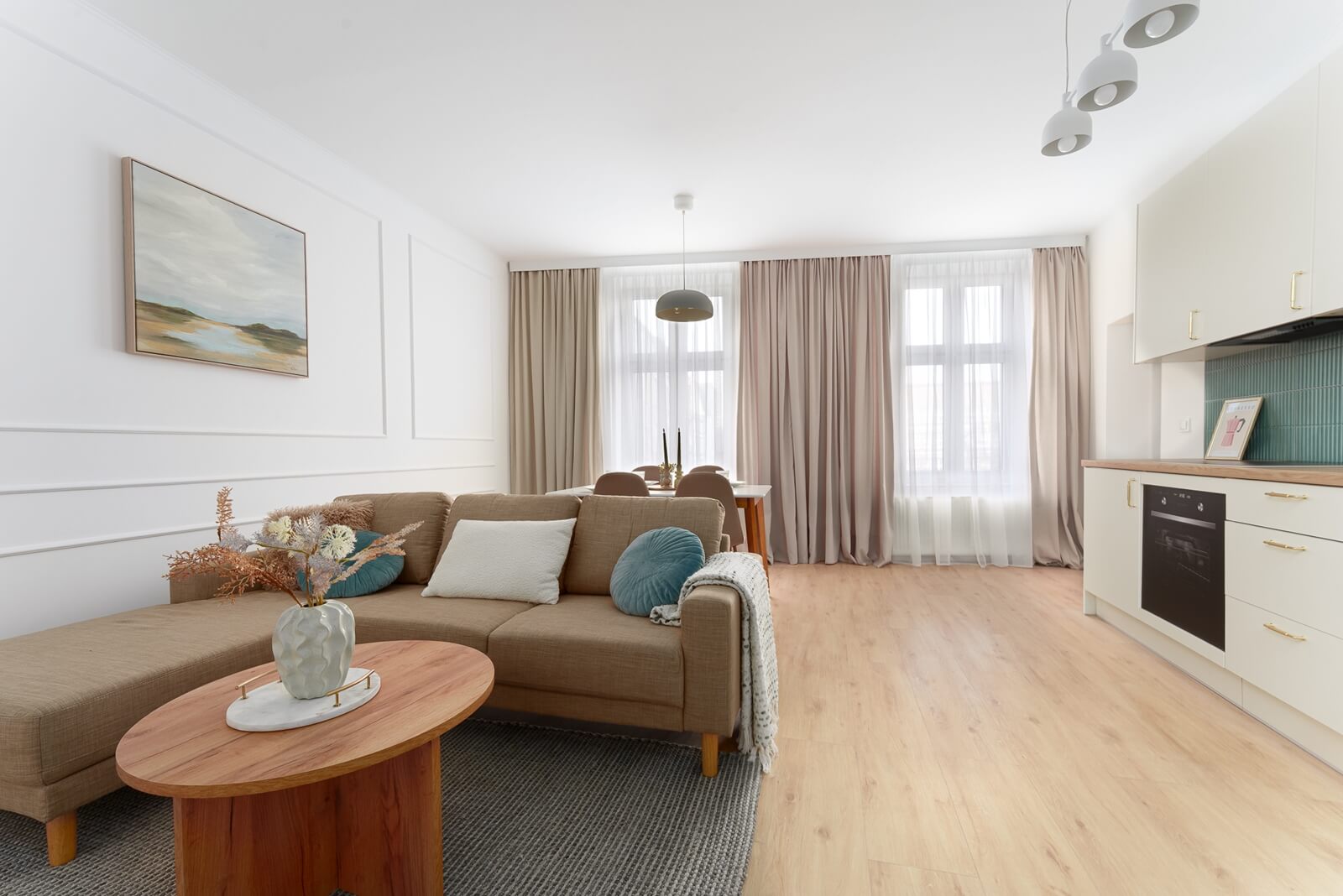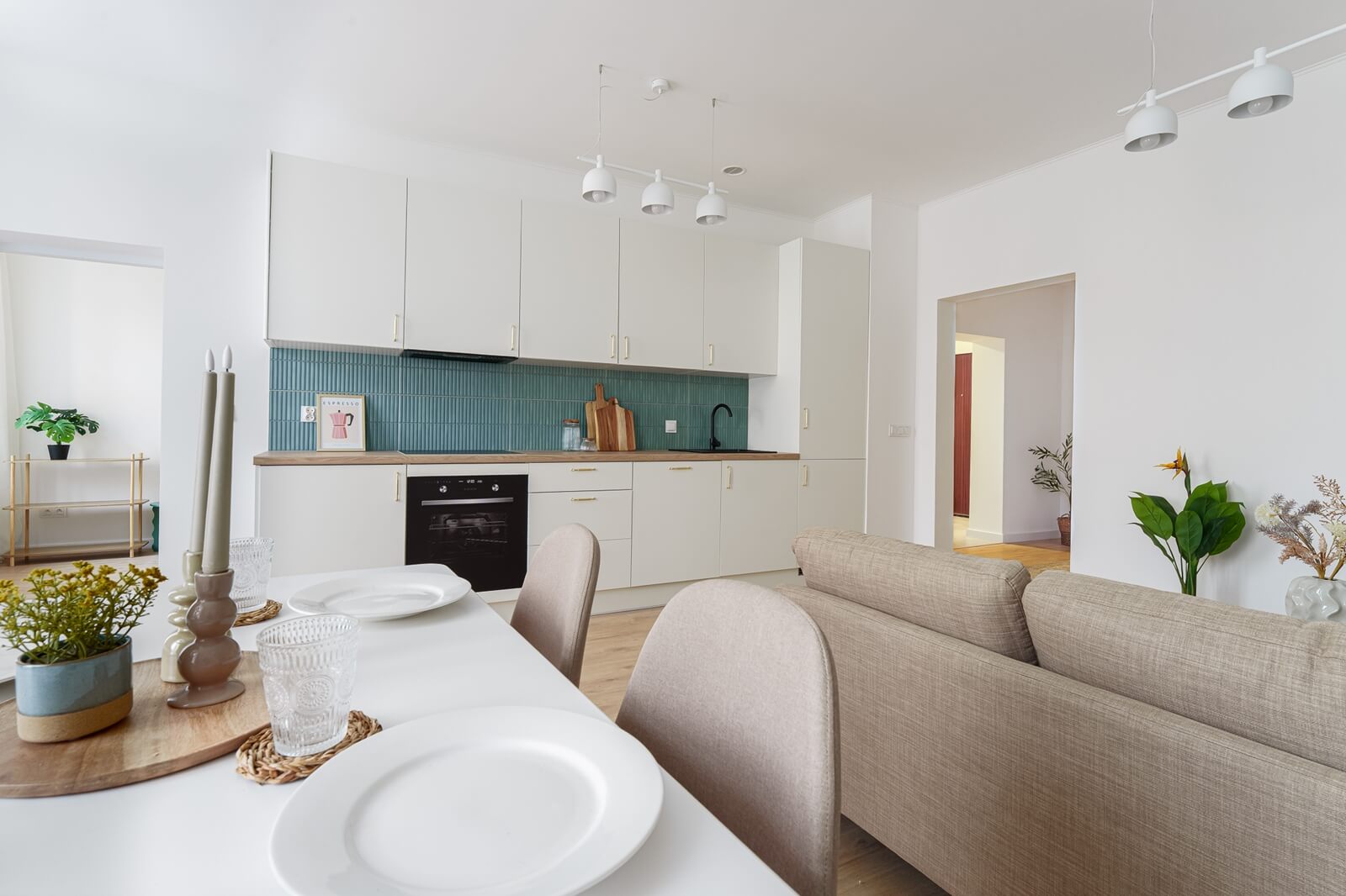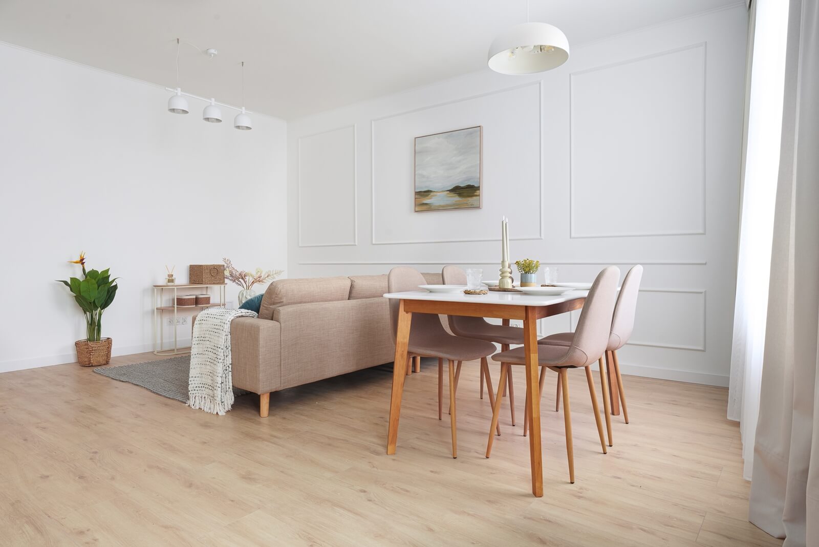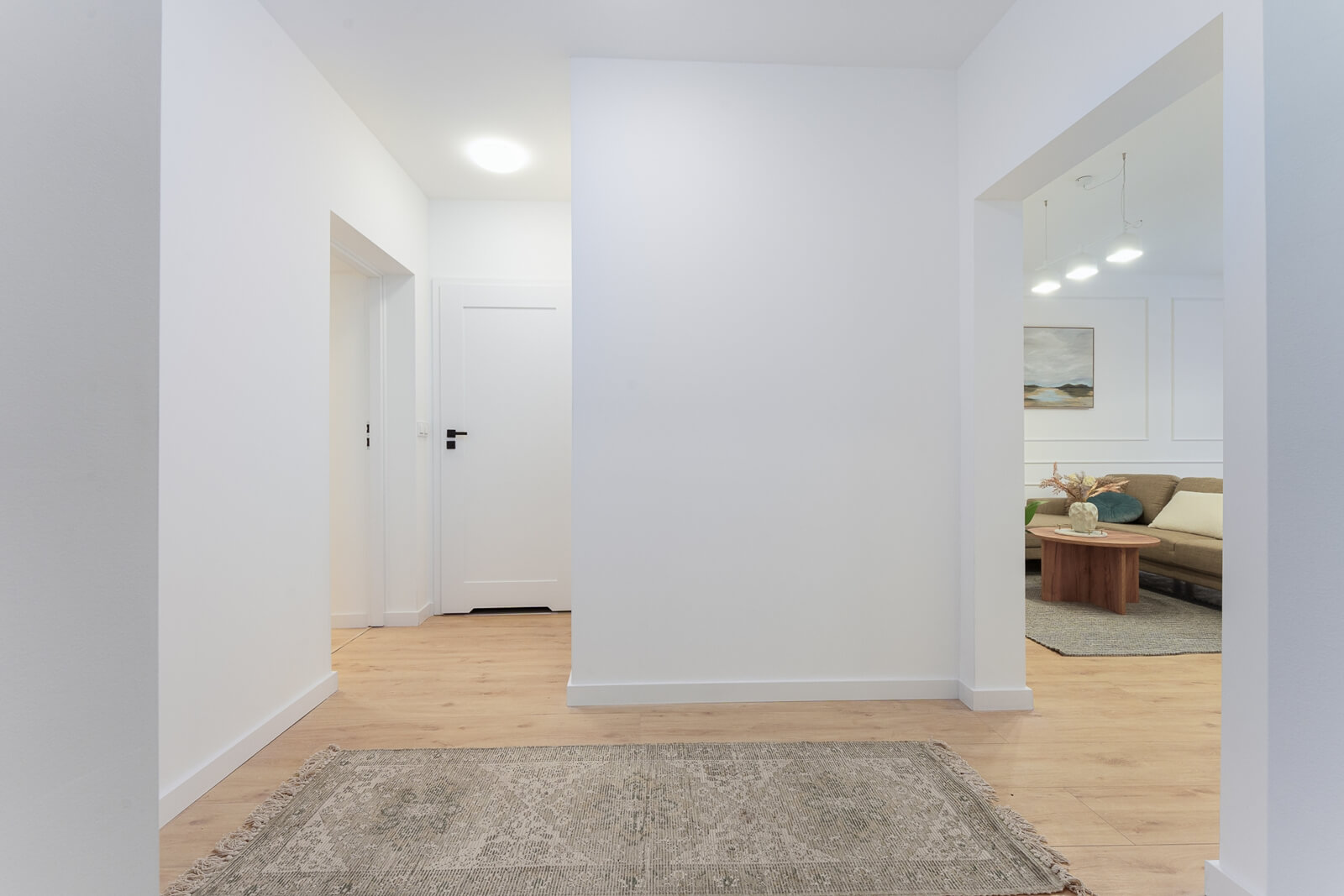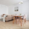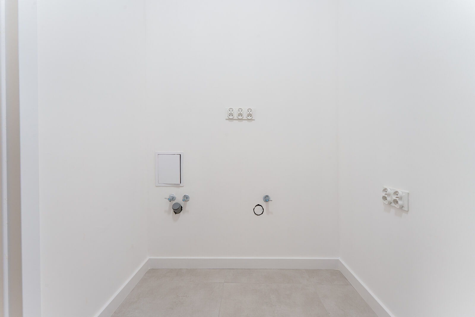 Salon z aneksem kuchennym, 2 sypialnie, łazienka, pralnia z suszarnią, przedpokój.