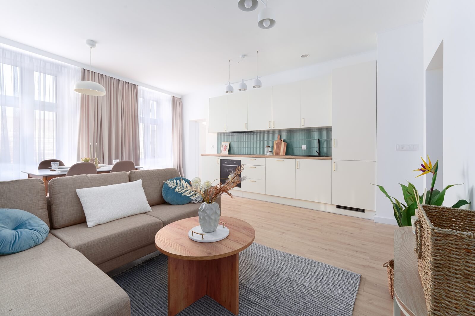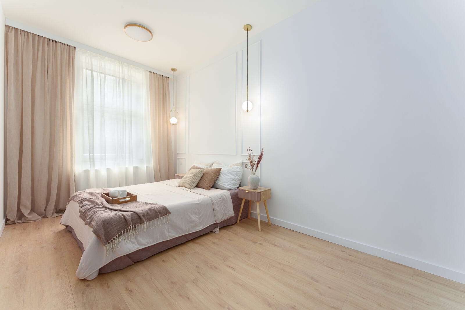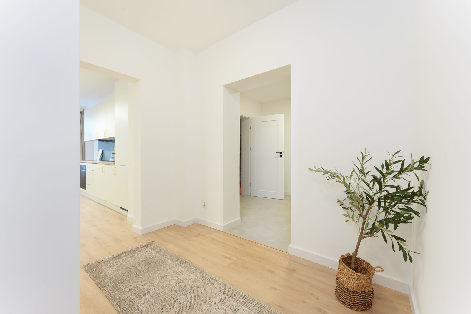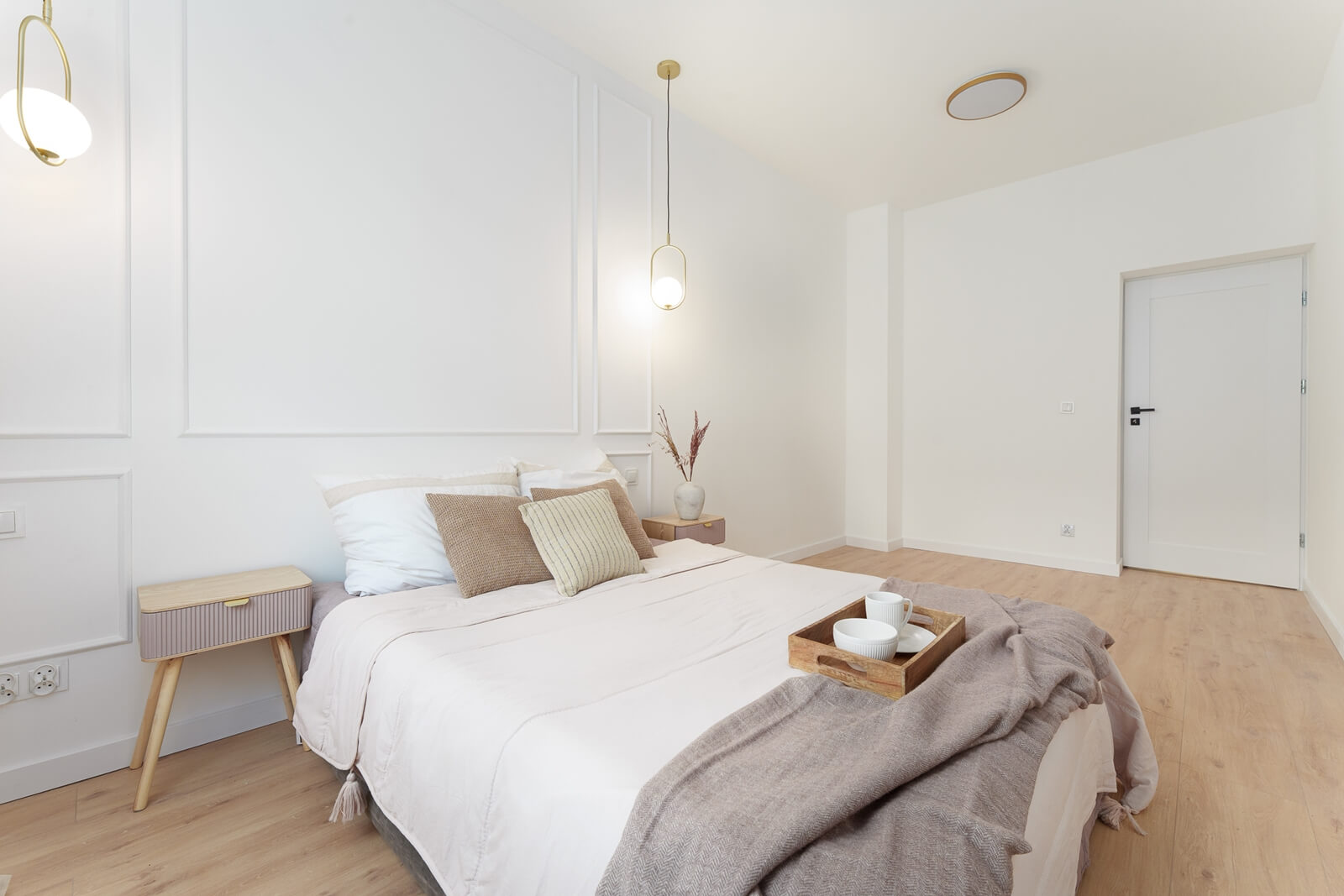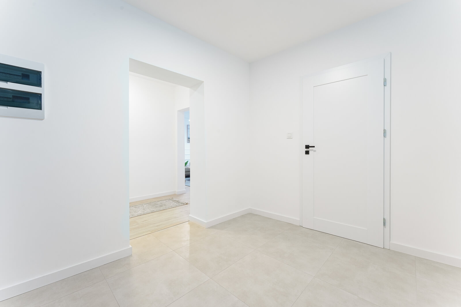 Salon z aneksem kuchennym, 2 sypialnie, łazienka, pralnia z suszarnią, przedpokój.