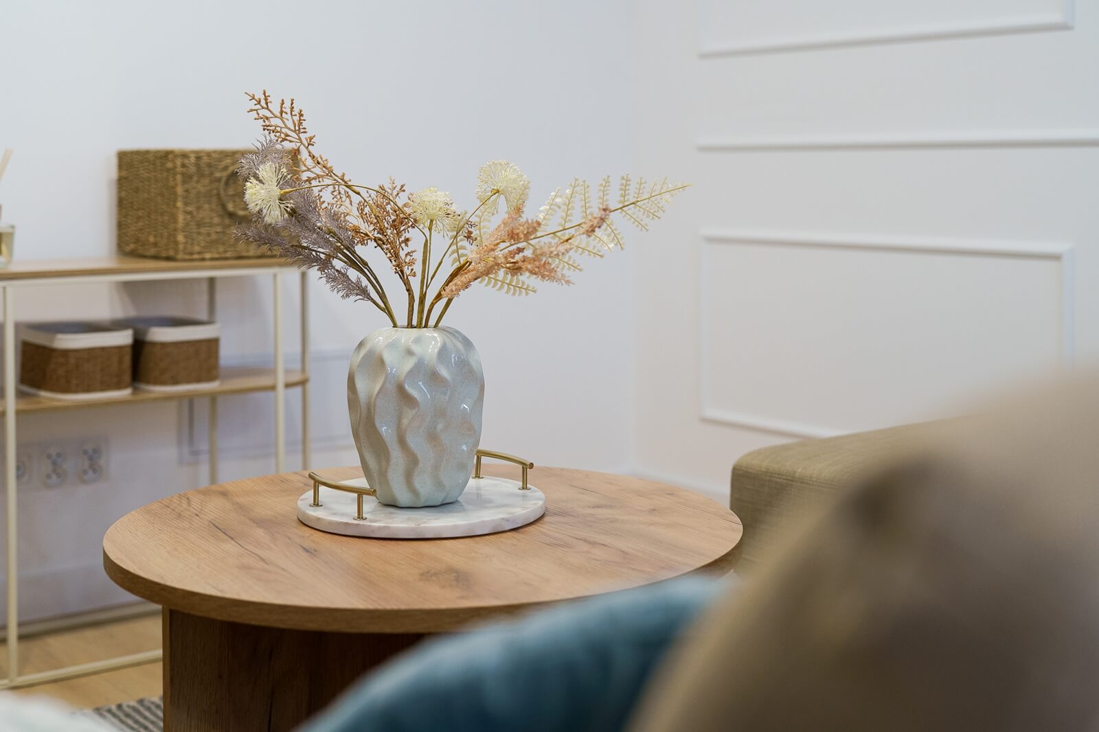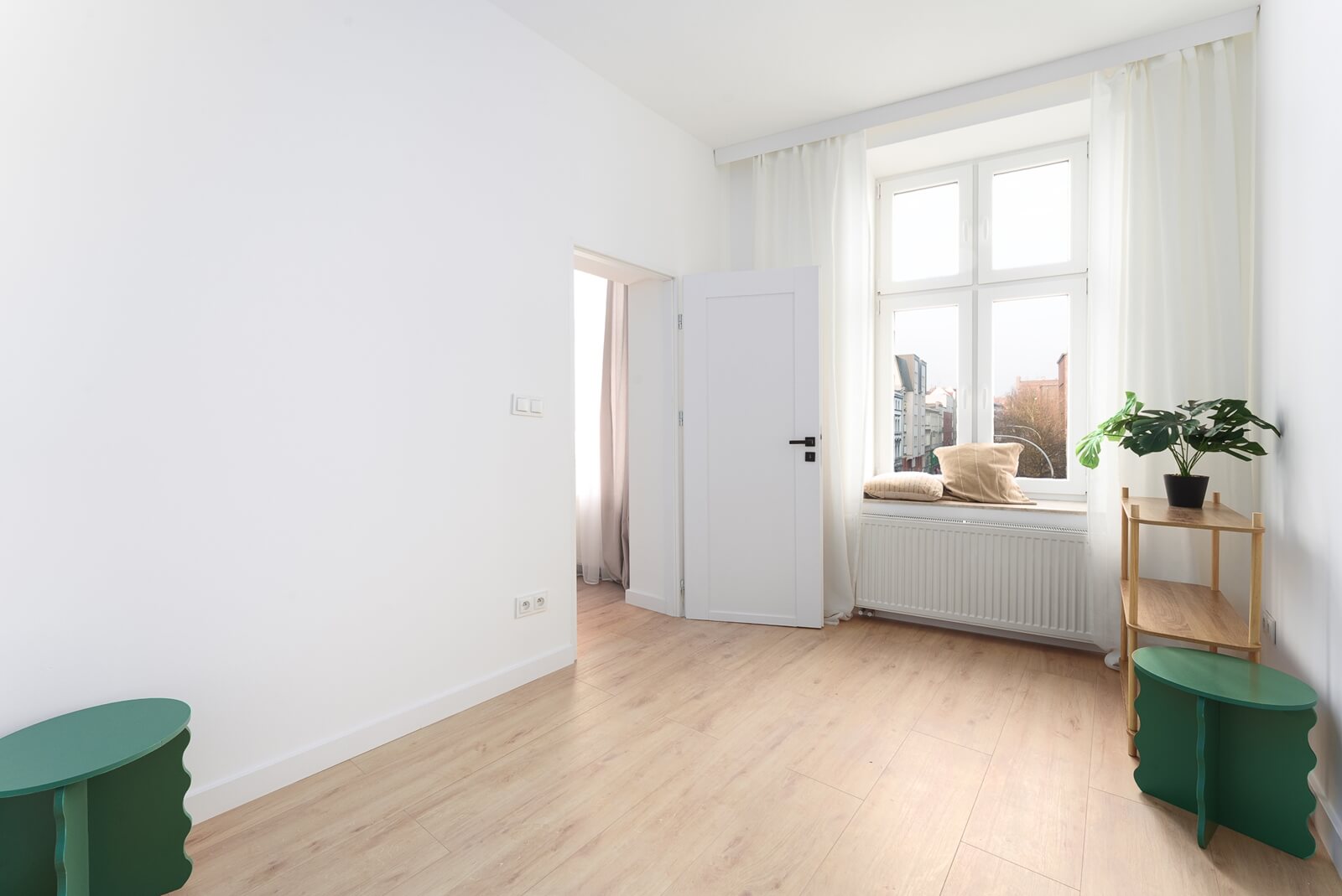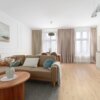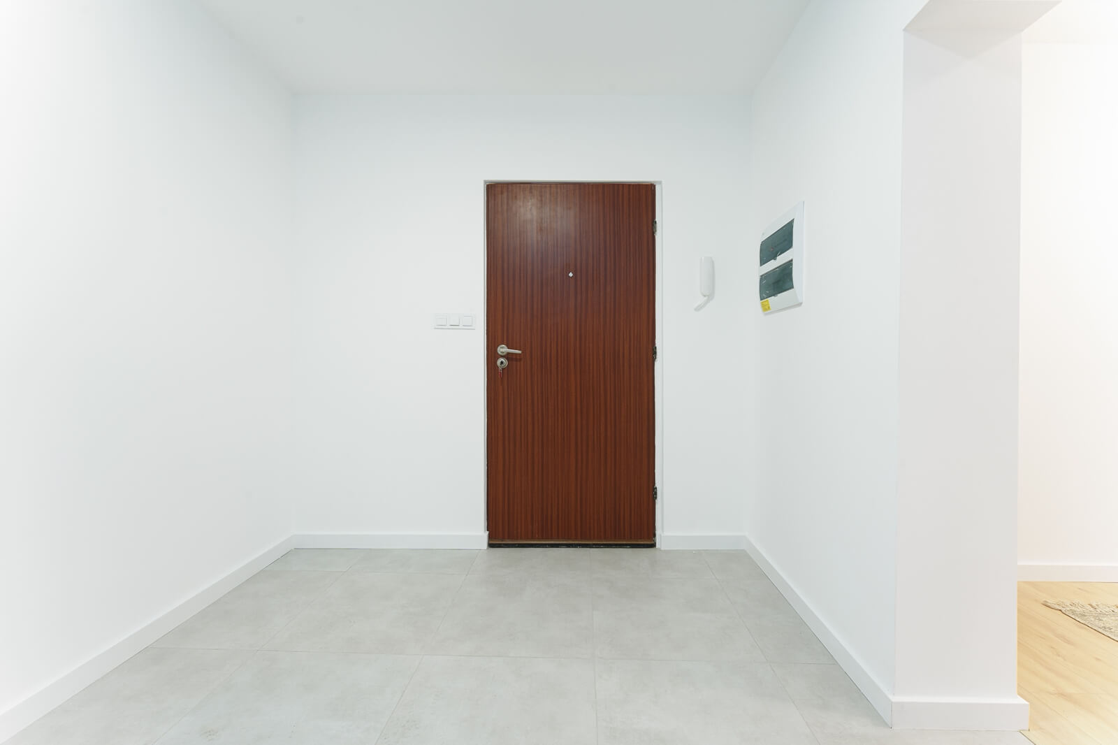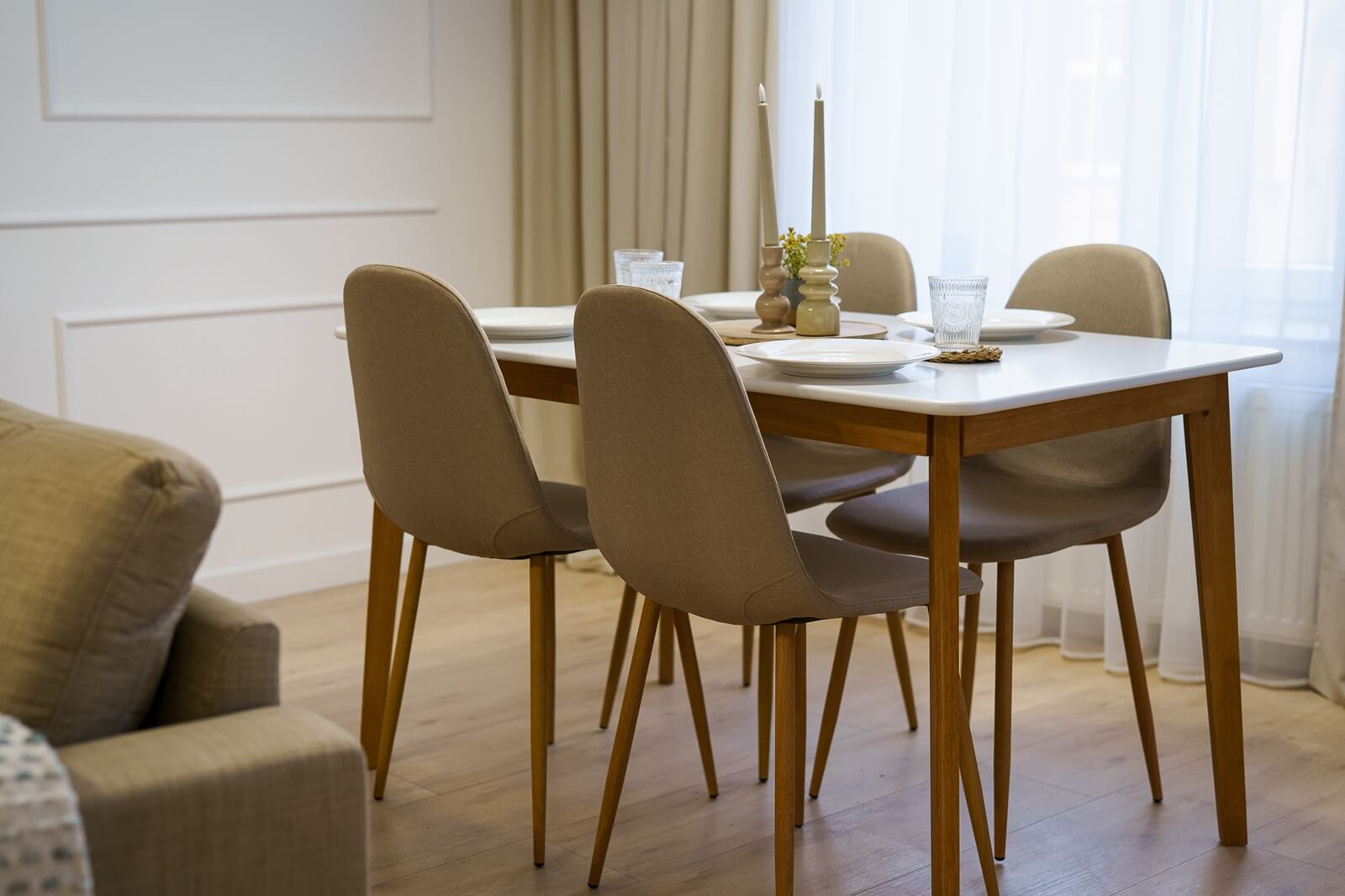 Salon z aneksem kuchennym, 2 sypialnie, łazienka, pralnia z suszarnią, przedpokój.