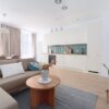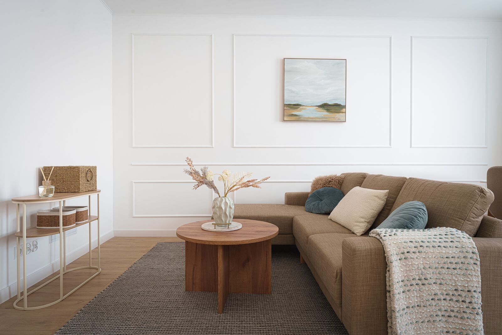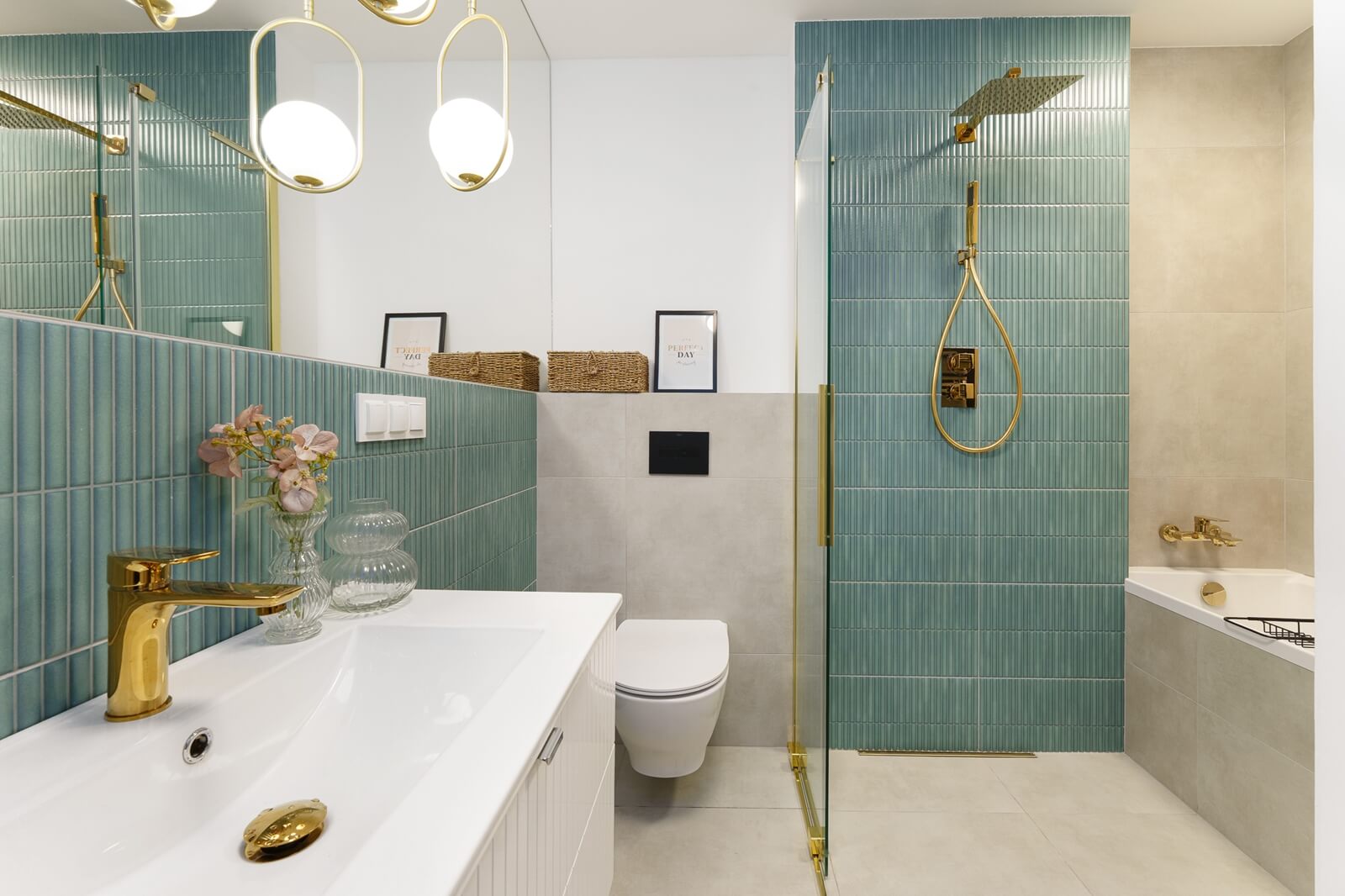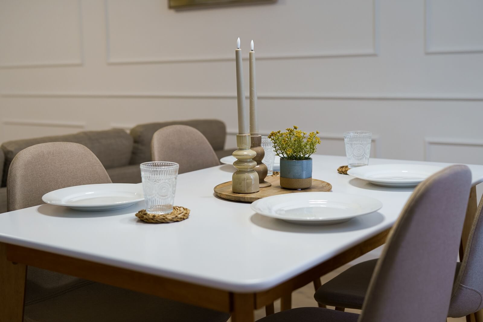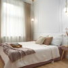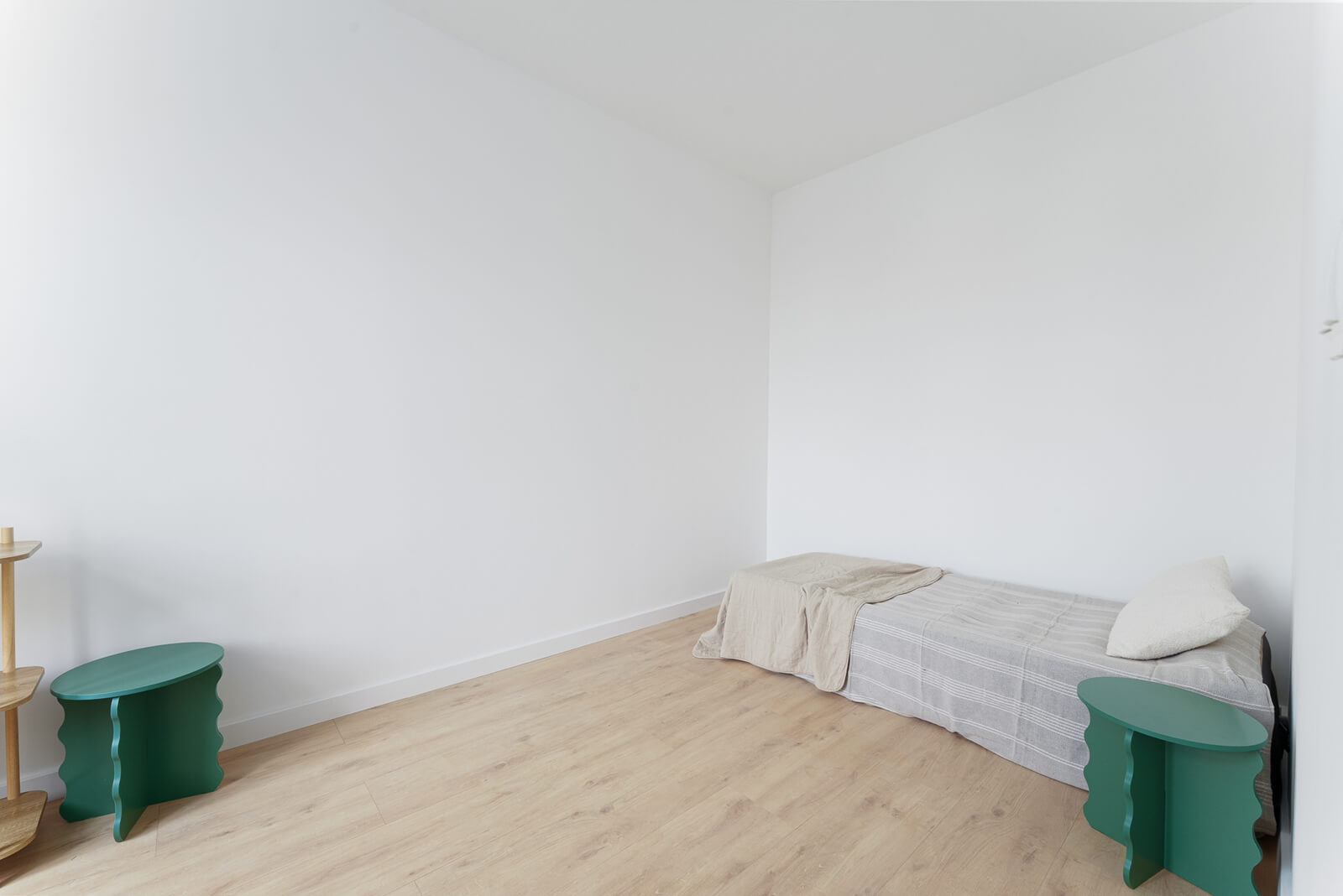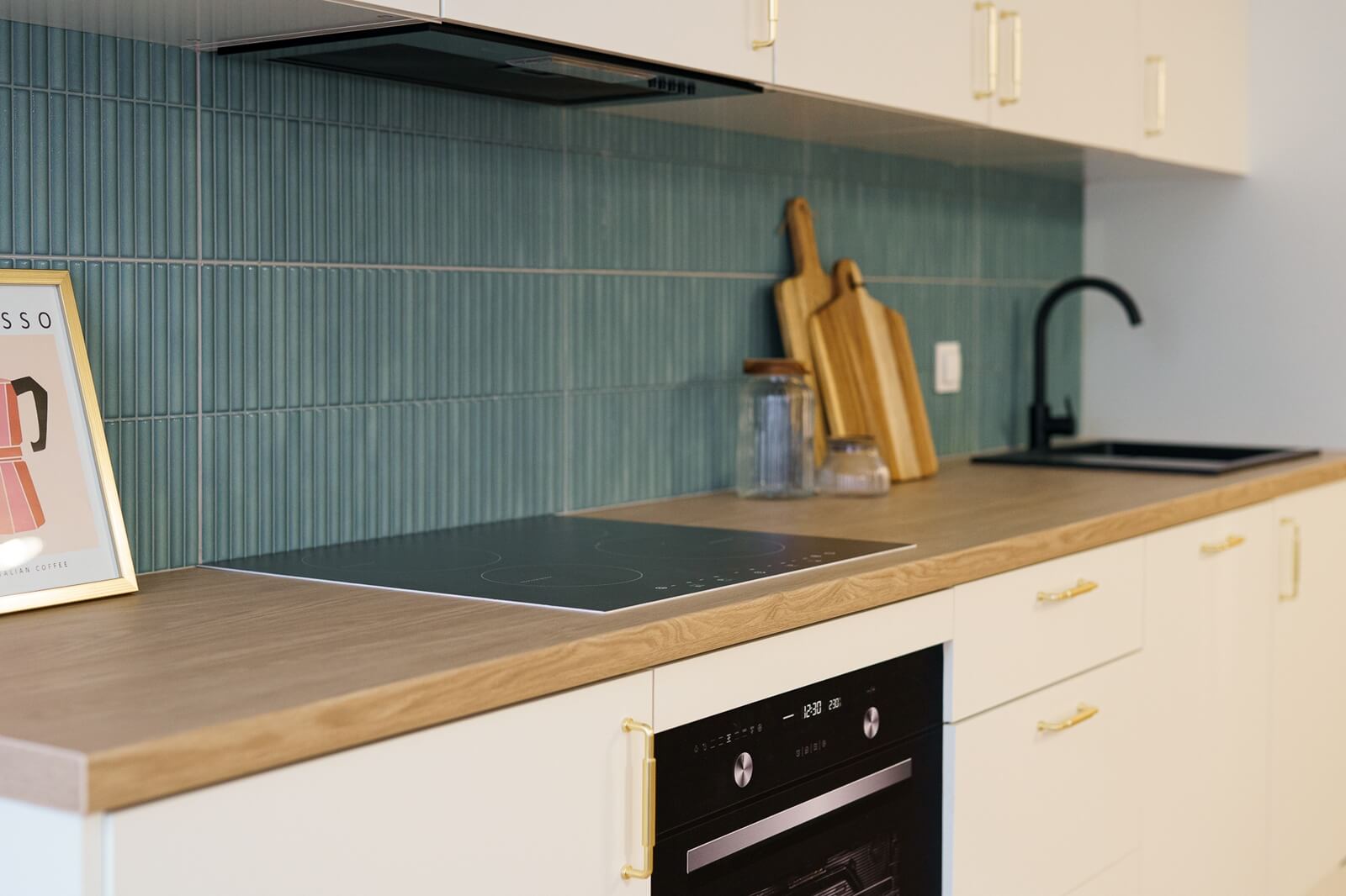 Salon z aneksem kuchennym, 2 sypialnie, łazienka, pralnia z suszarnią, przedpokój.